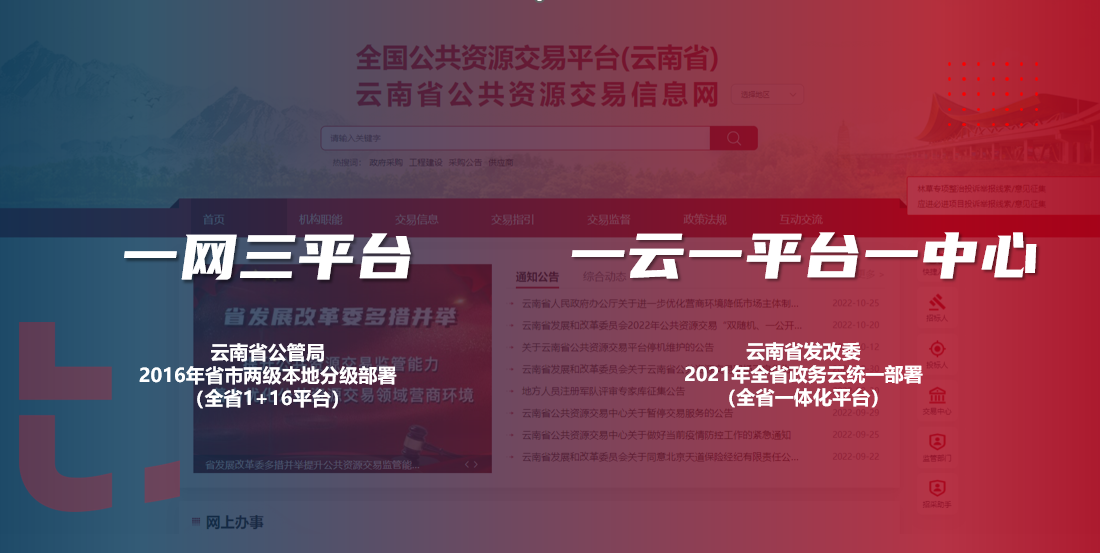 孫新介紹到,“云南省公共資源交易平臺建設兩個階段:2016年完成了一網三平臺的搭建,在全省尚未建設統一政務云的前提下,采用省市兩級(全省1+16平臺)分布部署的方案,并在全省實現主體互認和CA互認。而直到現在,全國仍有很多區域尚未形成這一格局;2018年依托‘數字云南’規劃的全省統一政務云算力平臺,最終形成了云南全省公共資源一體化的‘一云一平臺一中心’的格局。”