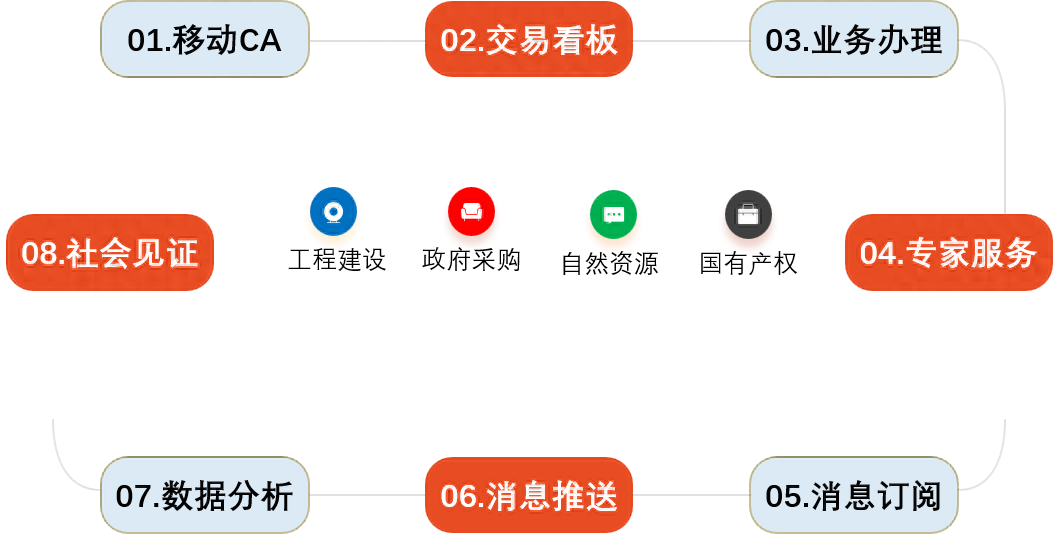移動端APP為內蒙古自治區本級公共資源交易APP,為全區各級各類公共資源交易電子化系統提供移動端窗口、監管通道和綜合服務支撐。覆蓋工程建設、政府采購、國有產權、自然資源4大交易領域,包含移動CA、交易看板、業務辦理、專家服務、消息訂閱、消息推送、數據分析、社會見證8大功能支持。實現移動端在手,交易服務應有盡有的公共資源交易新體驗。